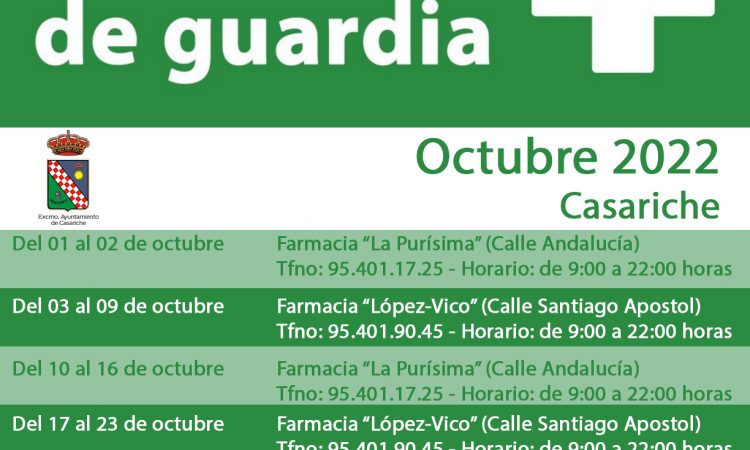 Con el fin de que nuestr@s vecin@s puedan saber en todo momento qué farmacia está de guardia en nuestro municipio, el Ayuntamiento pone a su disposición la información sobre las farmacias de guardia durante el mes de Octubre, incluyendo sus números de teléfono y el horario de apertura que tienen.