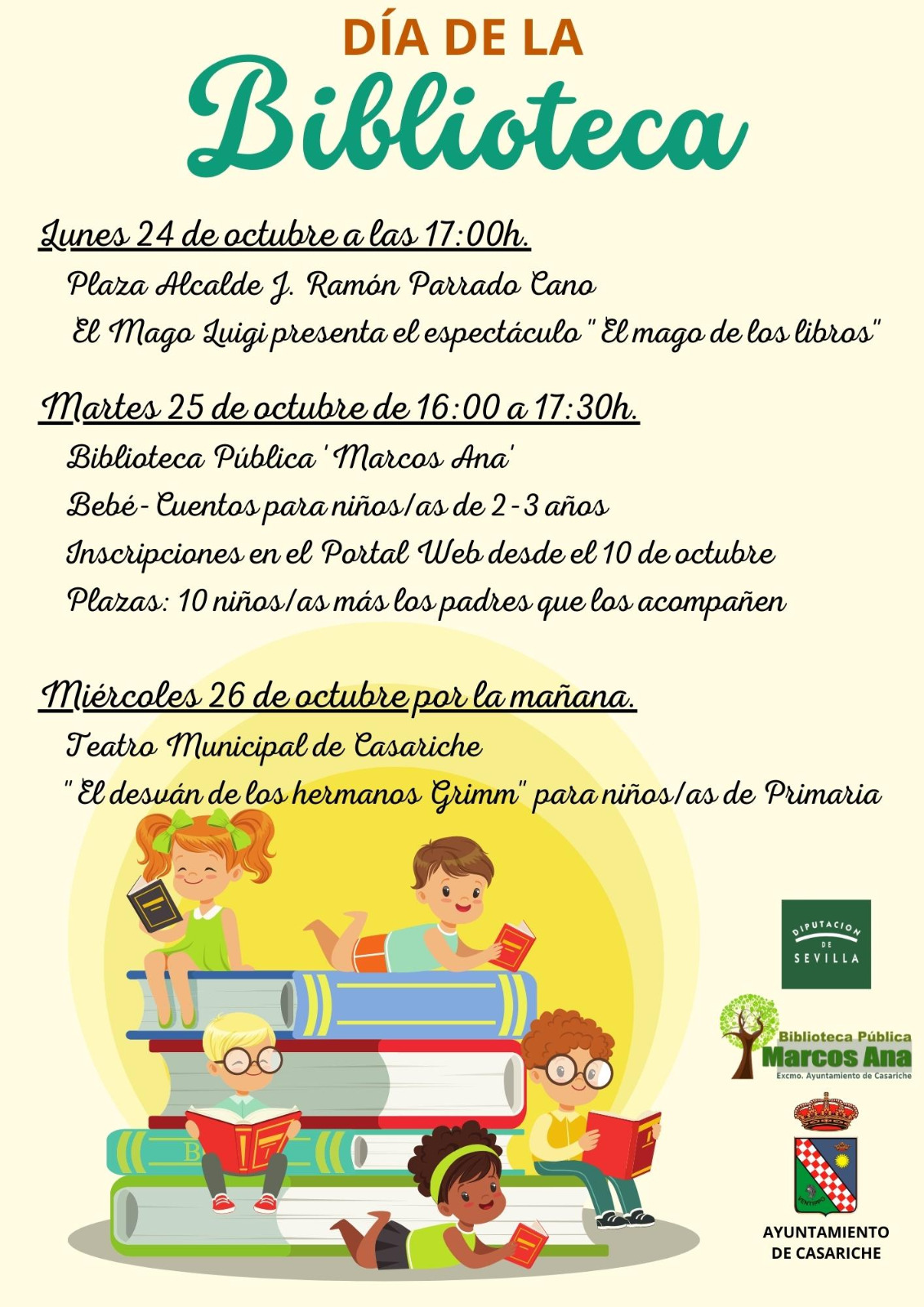- El martes 25 de Octubre, de 16:00 h a 17:30 h, la Biblioteca Pública ‘Marcos Ana’ acogerá la actividad Bebé-Cuentos para niños/as de 2-3 años, que tiene aforo limitado (10 niños/as más los padres que los acompañen), por lo que es necesario inscribirse previamente en el portal de inscripciones municipal: https://inscripciones.casariche.es
