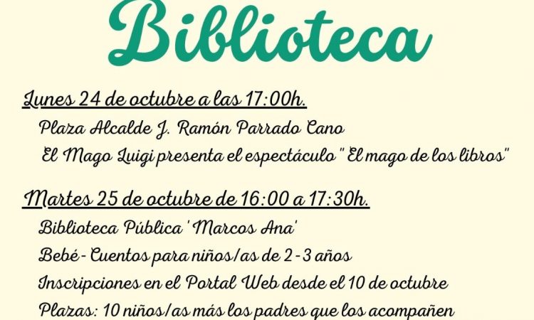 - El lunes 24 de Octubre, a las 17:00 h, en la Plaza Alcalde José Ramón Parrado Cano, El Mago Luigi presentará su espectáculo ‘El mago de los libros’.