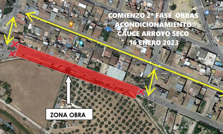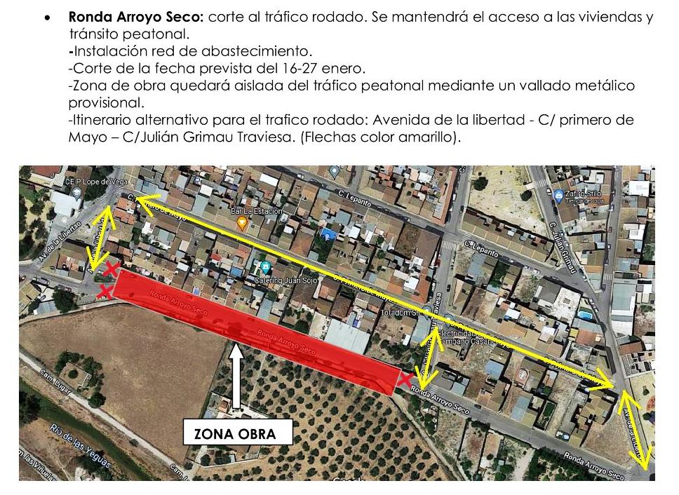 En el caso de la Ronda Arroyo Seco, se ejecutarán la canalización de abastecimiento y la capa de aglomerado, así como las actuaciones complementarias previstas. El paso quedará cortado al tráfico rodado, pero se mantendrá el acceso a las viviendas y el tránsito peatonal. Al igual que en la fase anterior, se habilitará un itinerario alternativo en las calles aledañas, mientras estén los cortes programados por la empresa constructora.