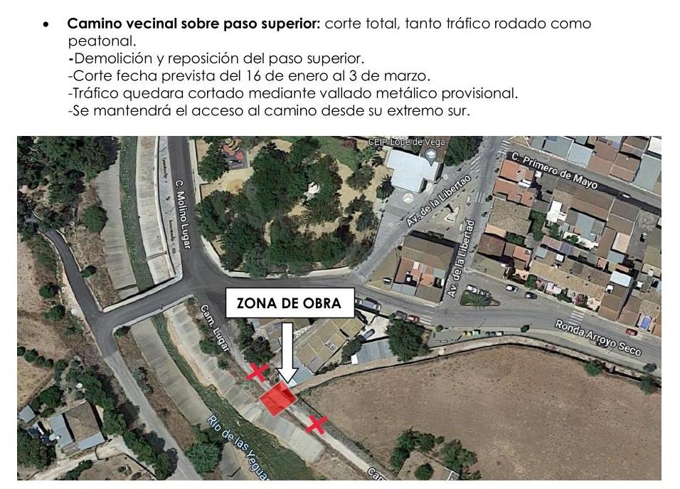Con respecto al camino vecinal, se demolerá el actual paso y se procederá a la ejecución del definitivo, por lo que el corte será total, tanto tráfico rodado como peatonal.