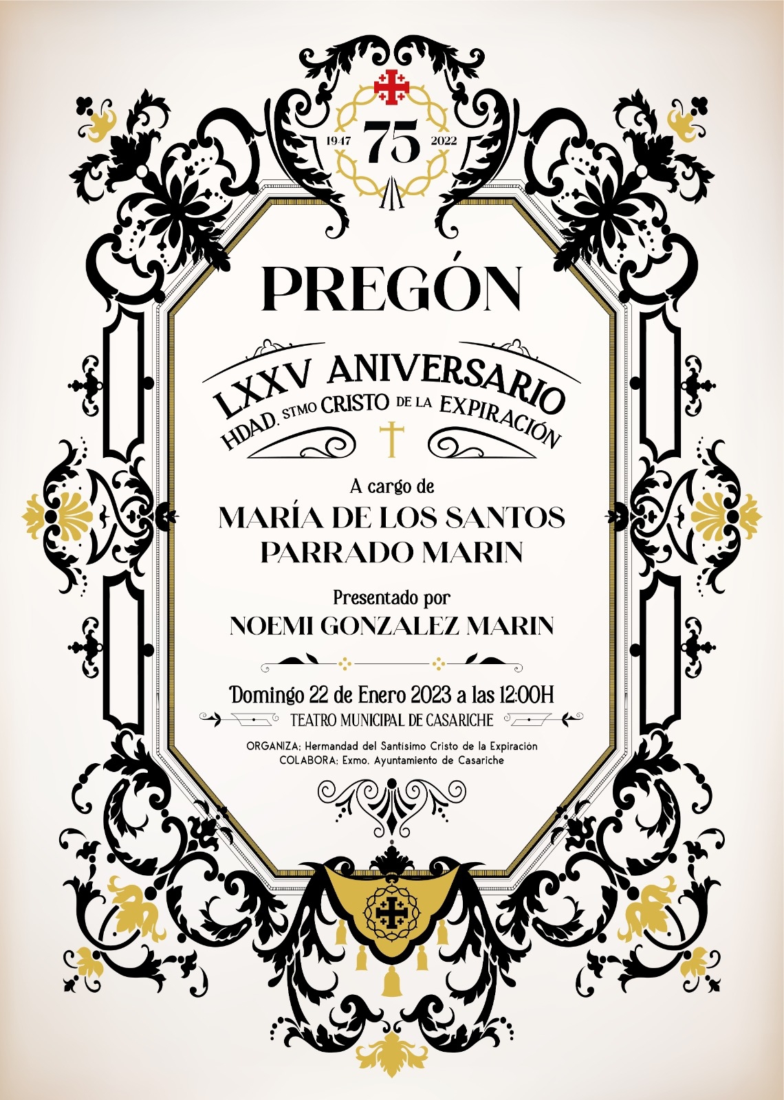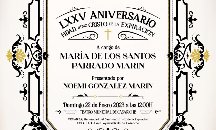 Este acto, organizado por la Hermandad del Santísimo Cristo de la Expiración y con el que colabora el Ayuntamiento, se enmarca en los actos y eventos conmemorativos del 75 aniversario de su fundación, que esta Hermandad casaricheña está desarrollando, y que culminarán con la Salida Extraordinaria de la Imagen del Santísimo Cristo de la Expiración el 29 de Enero de 2023.