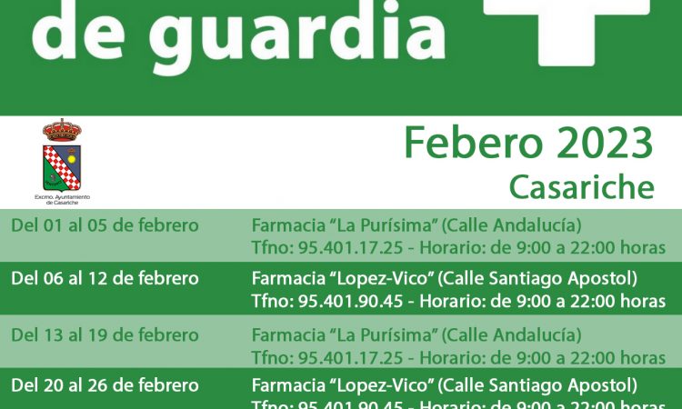 Con el fin de que nuestr@s vecin@s puedan saber en todo momento qué farmacia está de guardia en nuestro municipio, el Ayuntamiento pone a su disposición la información sobre las farmacias de guardia durante el mes de Febrero, incluyendo sus números de teléfono y el horario de apertura que tienen.