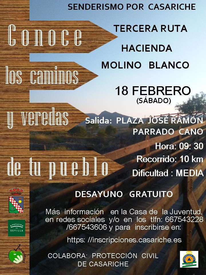 La Delegación de Juventud ha organizado ya la tercera ruta enmarcada en el programa «Conoce los caminos y veredas de tu pueblo» de esta temporada, que se celebrará el sábado 18 de febrero y nos llevará a la ‘Hacienda Molino Blanco’. Se trata de una ruta de dificultad media y de 10 km de recorrido.