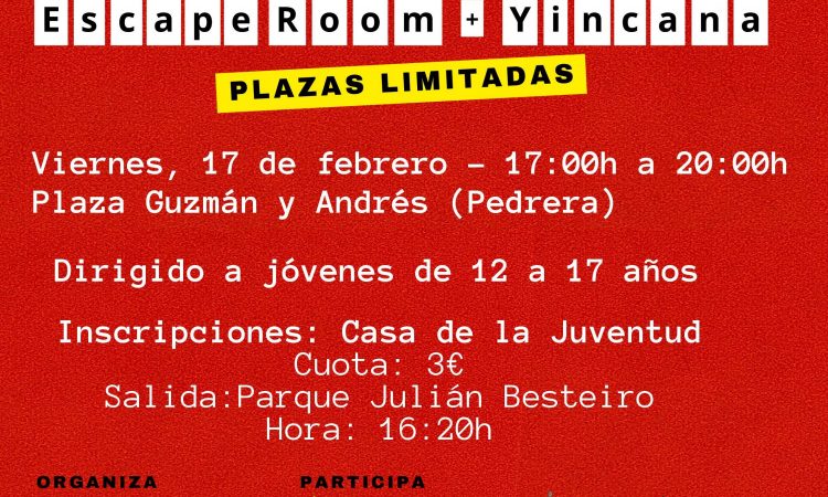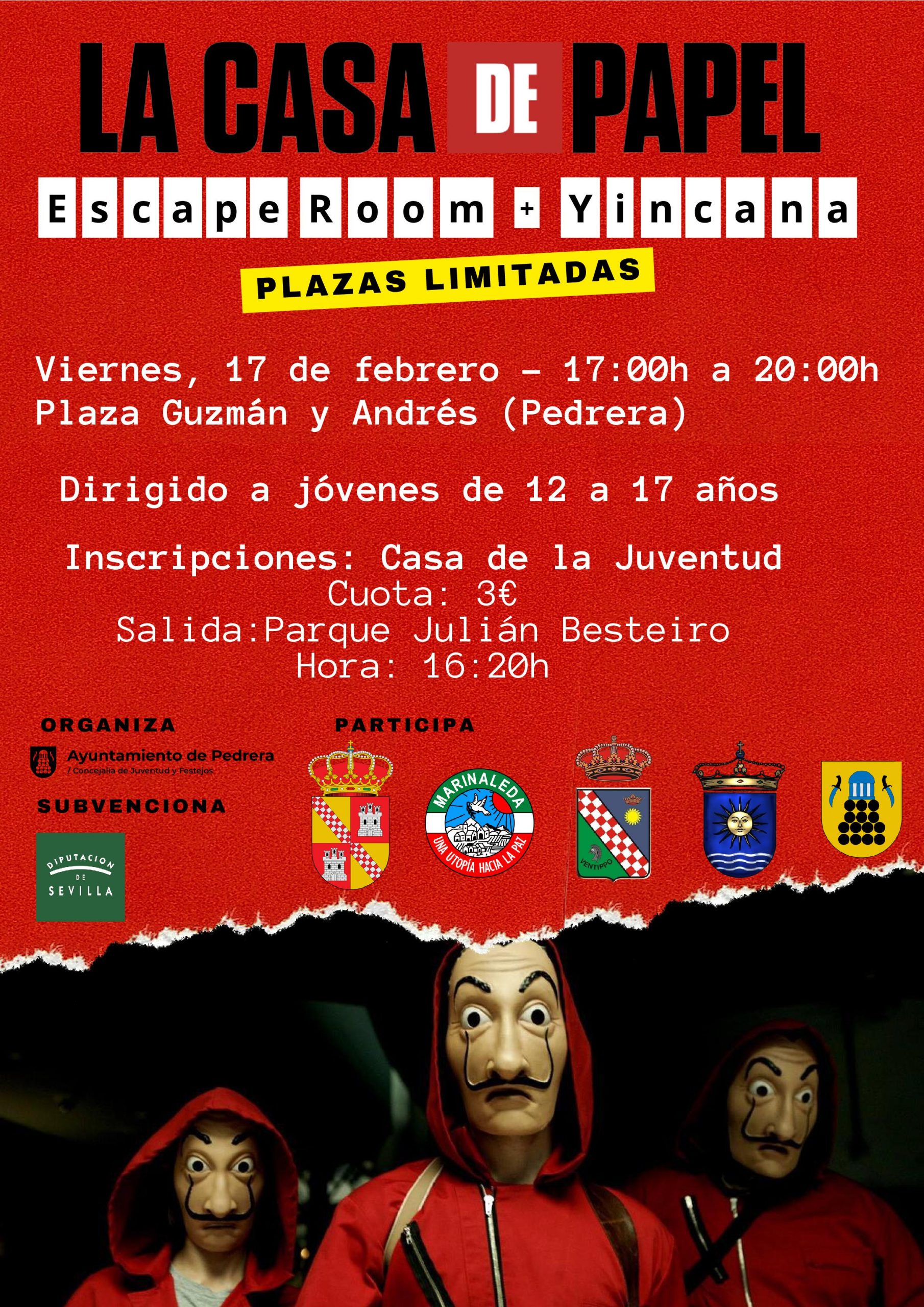 Se llevará a cabo este viernes 17 de Febrero en Pedrera y se trata de una actividad de ‘Escape Room y Yincana de La Casa de Papel’. La salida será a las 16:20 h, desde el Parque Julián Besteiro.