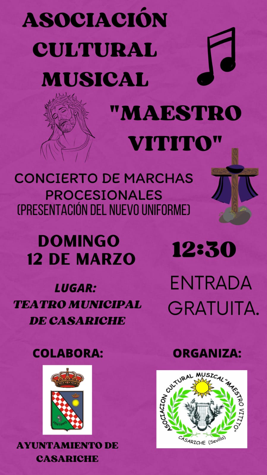 Este domingo 12 de Marzo tenemos en Casariche un Concierto de Marchas Procesionales a cargo de la Asociación Cultural Musical ‘Maestro Vitito’, que servirá además para la presentación oficial del nuevo uniforme de la banda casaricheña.
