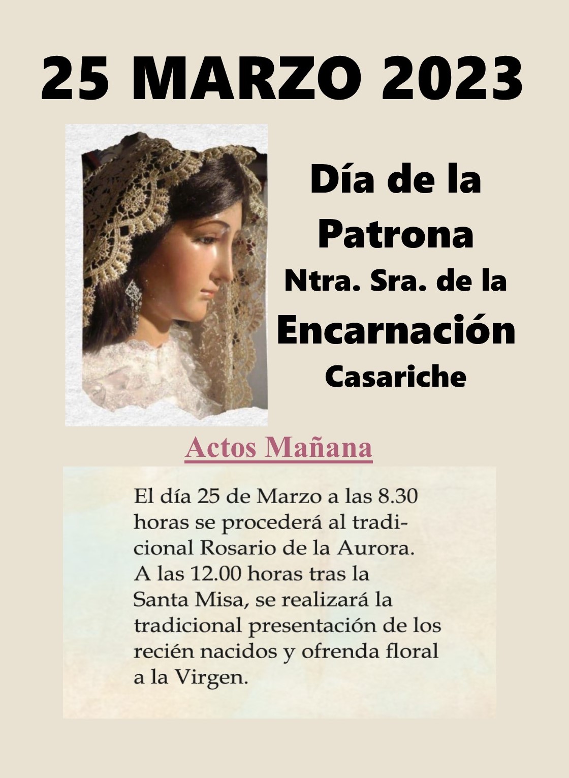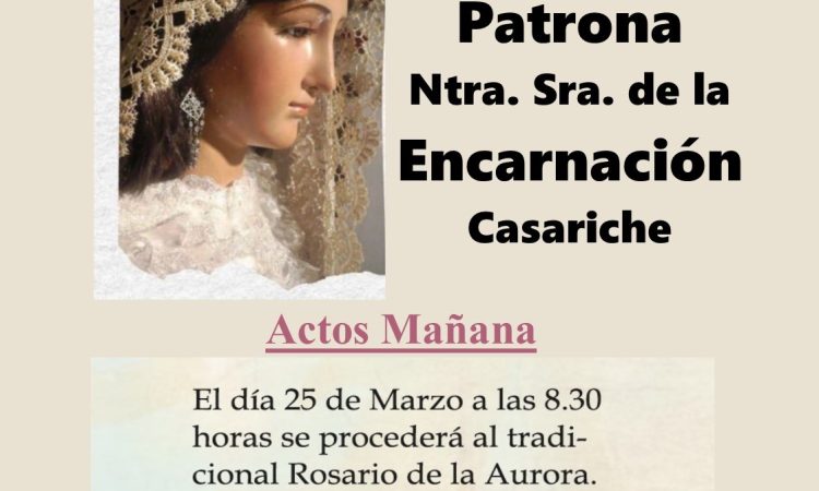 Este sábado, día 25 de Marzo, se celebra la onomástica de nuestra Patrona, la Virgen de la Encarnación, y como cada año se realizan una serie de actos conmemorativos en su honor.