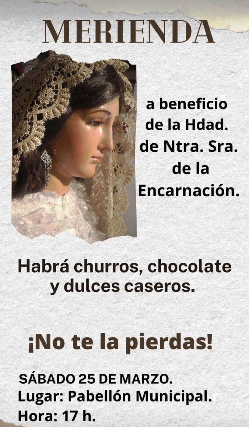 Por la tarde, a partir de las 17:00 h, en el Pabellón Municipal, habrá una merienda con chocolate, churros y dulces caseros a beneficio de la Hermandad de Ntra. Sra. de la Encarnación.