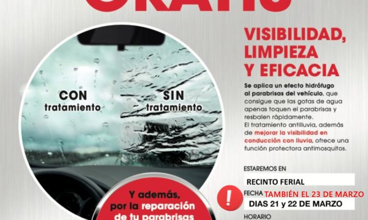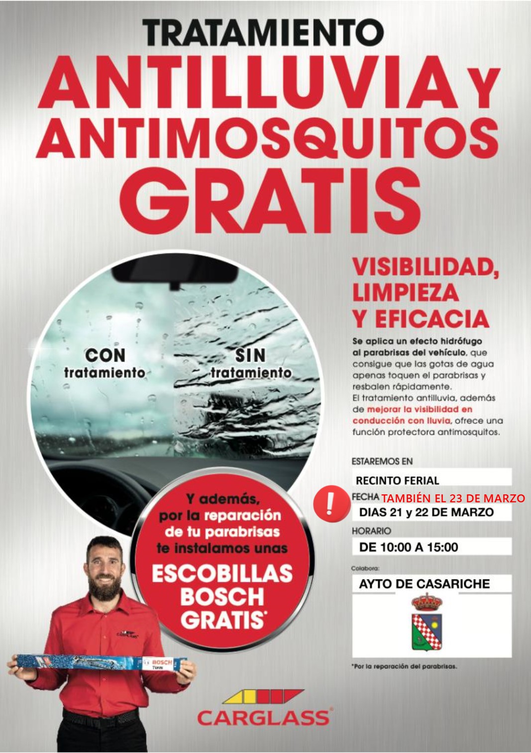 El Ayuntamiento informa que la firma Carglass ha ampliado un día su estancia en Casariche, por lo que estará también mañana 23 de Marzo en el Recinto Ferial, de 10:00 h a 15:00 h, para aplicar tratamiento antilluvia y antimosquitos de forma gratuita a las lunas de los vehículos.