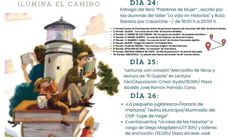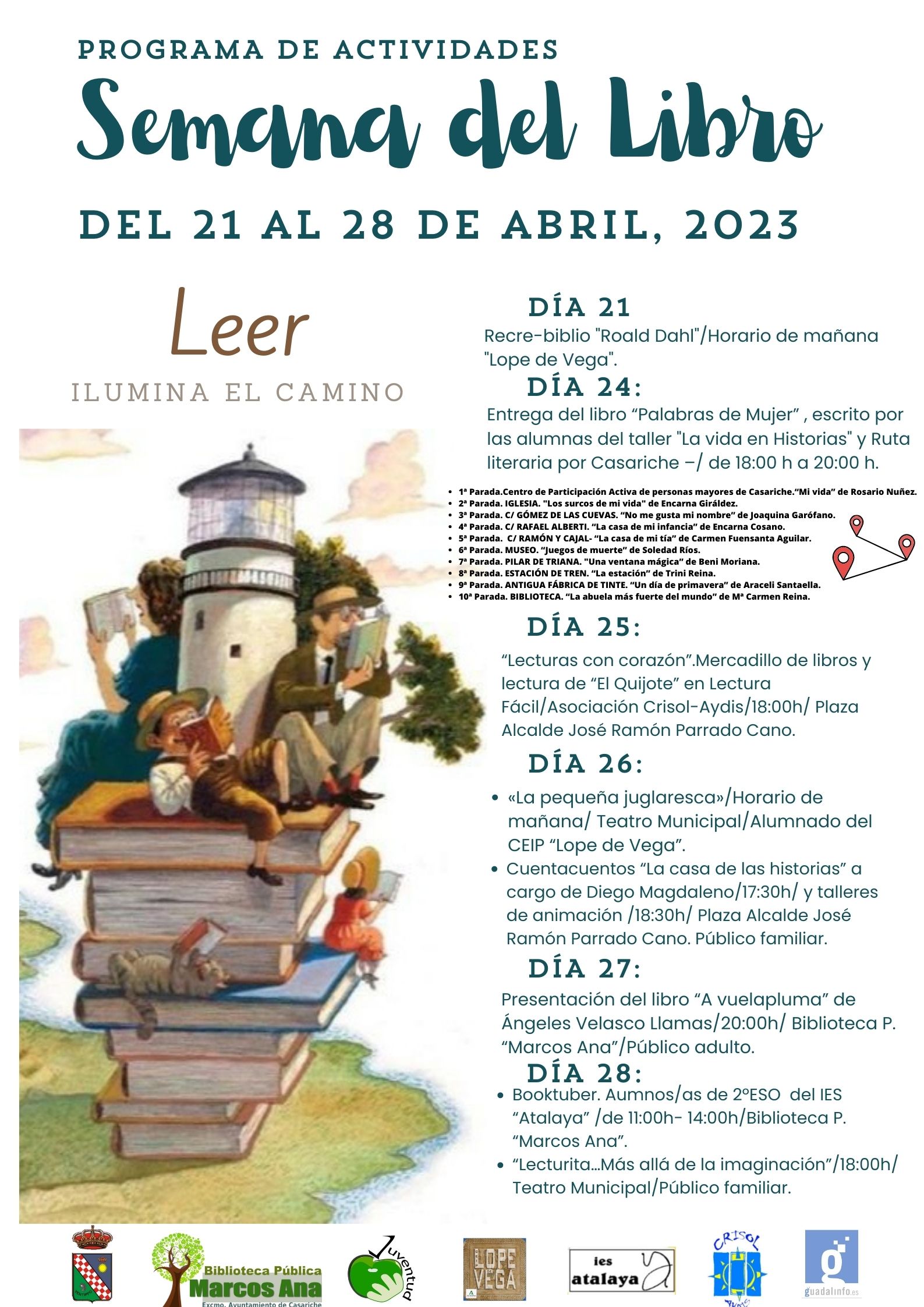 Para conmemorar el Día del Libro 2023, la Delegación de Cultura del Ayuntamiento de Casariche y la Biblioteca Pública ‘Marcos Ana’ han preparado en nuestro municipio una completa semana de actividades del 21 al 28 de Abril, que contempla propuestas tan interesantes como el recre-biblio, un mercadillo de libros, la entrega del libro escrito por el alumnado del Taller ‘La Vida en Historias’ y una ruta literaria por Casariche, la presentación de un libro, teatros, cuentacuentos y la actividad ‘Booktubers’.