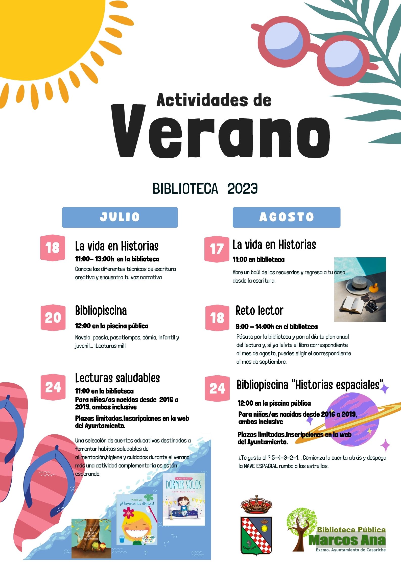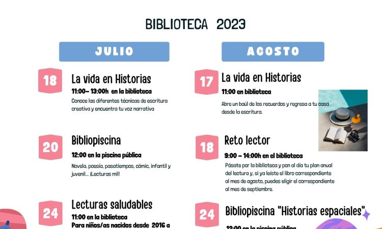 Hoy damos a conocer la completa y atractiva programación de la Biblioteca Pública ‘Marcos Ana’ para los meses de Julio y Agosto, que contempla dos nuevos encuentros de escritura creativa (los días 18 de Julio y 17 de Agosto), dos jornadas de Bibliopiscina en nuestra piscina municipal (el 20 Julio y el 24 de Agosto, este último con una sesión de cuentacuentos denominada ‘Historias espaciales’), así como una mañana de narración oral con Lecturas Saludables (el 24 de Julio) y el Reto Lector (el 18 de Agosto), para que podáis actualizar vuestro plan anual de lectura.