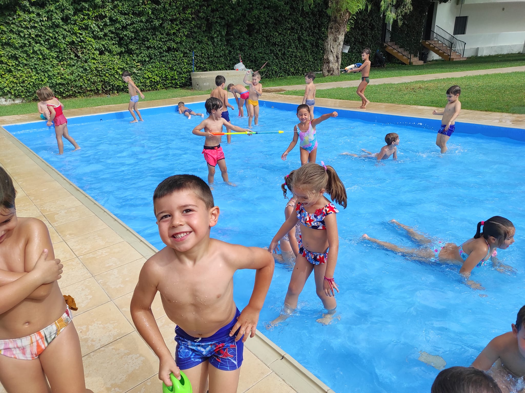 Bajo la estrecha supervisión de sus monitores y monitoras y en dos turnos (dos grupos asisten los martes y otros dos los miércoles), los más peques del Campamento Urbano tienen también su día semanal de piscina en la piscina infantil, donde pueden refrescarse y tomar parte en juegos en el agua.