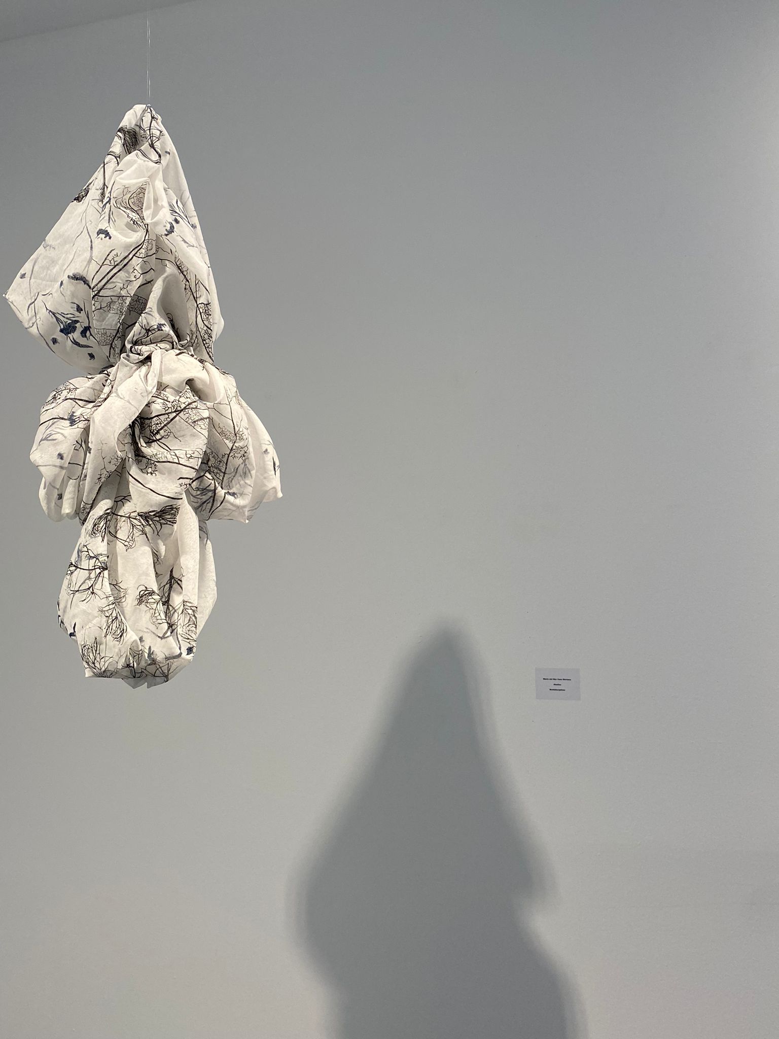 Se trata de un retal de visillo serigrafiado con motivos vegetales, partiendo de hojas y flores trazados con línea y mancha en dos tonos negro y azul sobre el tejido blanco traslúcido. El patrón de la estampa que se ha realizado in situ durante la serigrafía crea un entramado que hace que no se puedan diferenciar con gran claridad esas formas vegetales. Además la propia forma que se le da a la pieza textil uniéndola y suspendiéndola en el techo recuerda a una crisálida, a esas líneas sinuosas que podemos encontrar en la Naturaleza.