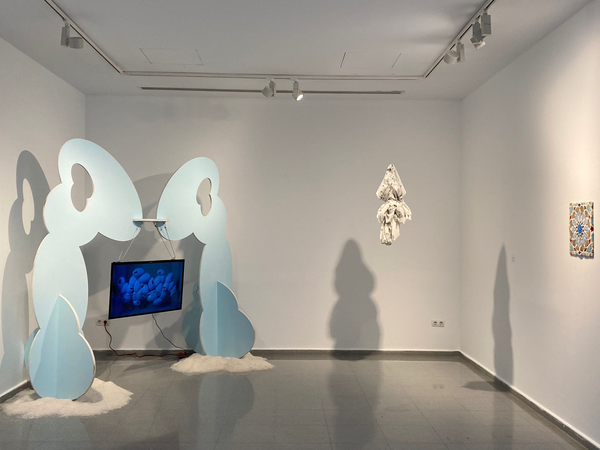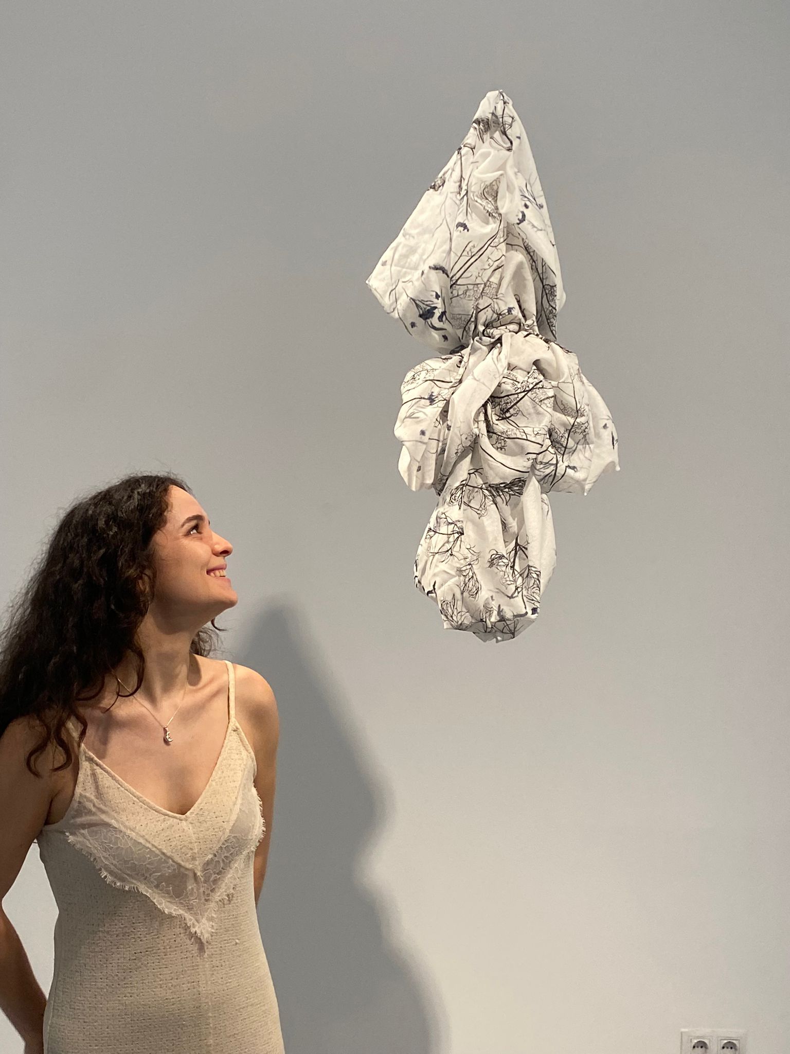 Según ha señalado la joven artista sobre la primera obra que expone, ‘Huellas’ es una pieza escultórica que se contempla dentro de la multidisciplina, formando parte también del arte textil, puesto que el material principal es la tela y su intervención y manipulación.