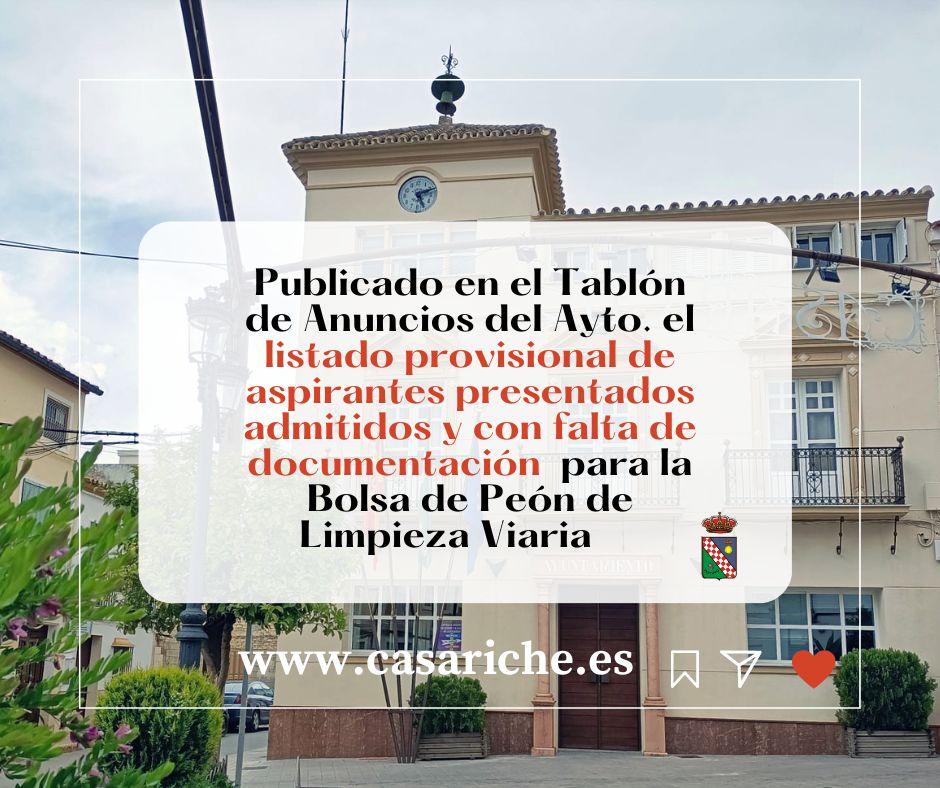 Desde la Delegación de Empleo se informa todos los vecinos y vecinas de Casariche que ya está disponible el Listado Provisional de aspirantes presentados admitidos y con falta de documentación para la Bolsa de Peón de Limpieza Viaria. Dicho listado se puede consultar en el Tablón de Anuncios de nuestro Ayuntamiento y en el E-tablón.