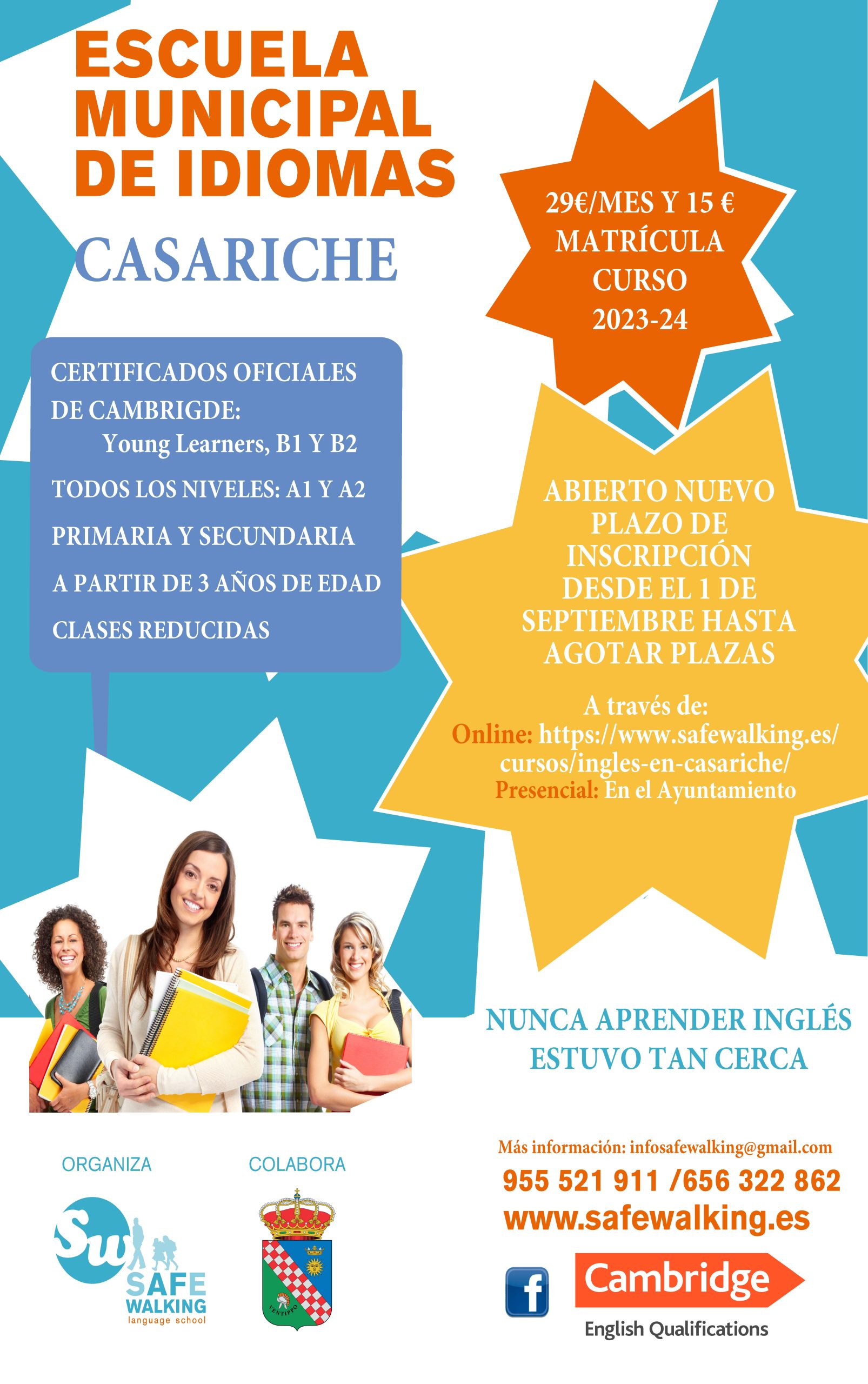 La Escuela Municipal de Idiomas «Safe Walking» en Casariche abre un nuevo plazo de inscripciones que estará habilitado a partir del próximo 1 de septiembre para el curso 2023/2024 que se mantendrá activo hasta agotar el número total de plazas ofertadas.