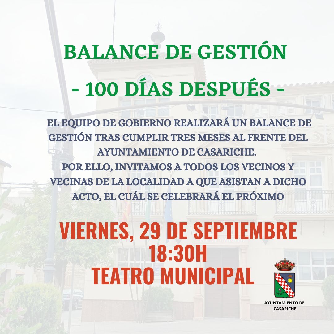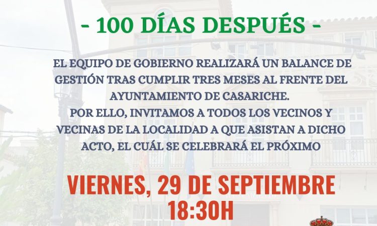 El próximo viernes 29 de septiembre es el día elegido por el Equipo de Gobierno para llevar a cabo la celebración de una Asamblea Informativa tras 100 días al frente del Ayuntamiento.
