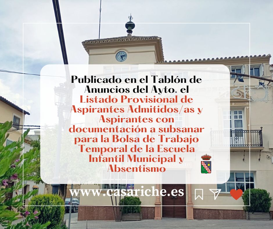 Desde la Delegación de Empleo informamos a todos los vecinos y vecinas de Casariche que ya está disponible, tanto en el Tablón de Anuncios de nuestro Ayuntamiento como en el E-tablón, el Listado Provisional de Aspirantes Admitidos y Aspirantes con documentación a subsanar de la convocatoria para la Contratación de Personal para la Escuela Infantil y el Servicio de Absentismo Municipal.