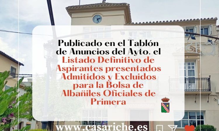 Desde el Ayuntamiento informamos que ya se puede consultar tanto en el Tablón de Anuncios del Ayuntamiento como en el E-Tablón el Listado Definitivo de Aspirantes Admitidos y Excluidos para la Bolsa de Albañiles Oficiales de Primera.