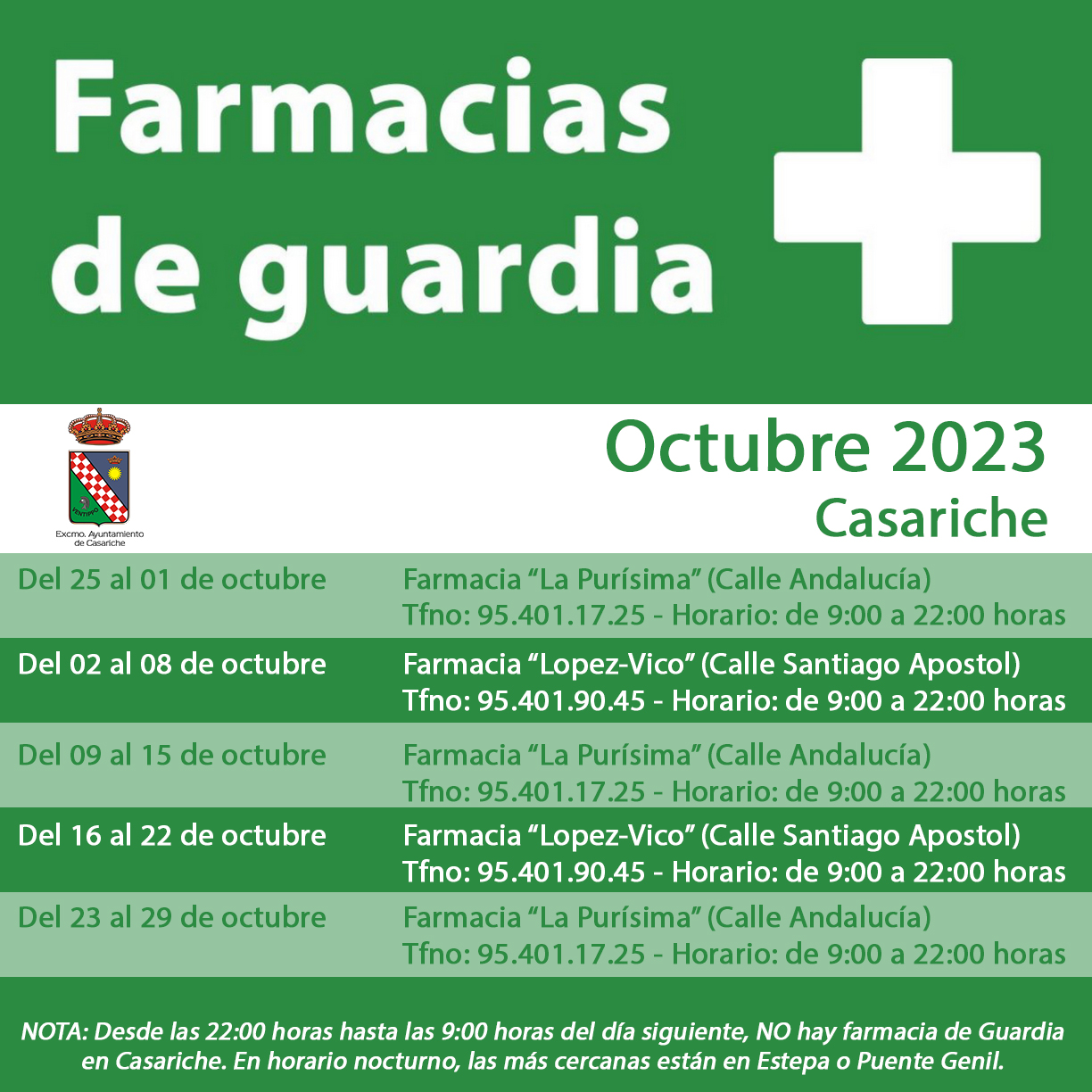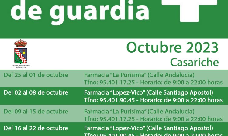 Ya estamos en octubre y con el fin de que nuestros vecinos y vecinas puedan saber en todo momento qué farmacia estará de guardia en nuestro municipio, el Ayuntamiento pone a su disposición la información relativa a las farmacias de nuestra localidad, incluyendo sus números de teléfono y el horario de apertura que tienen cada uno de los fines de semana del presente mes.
