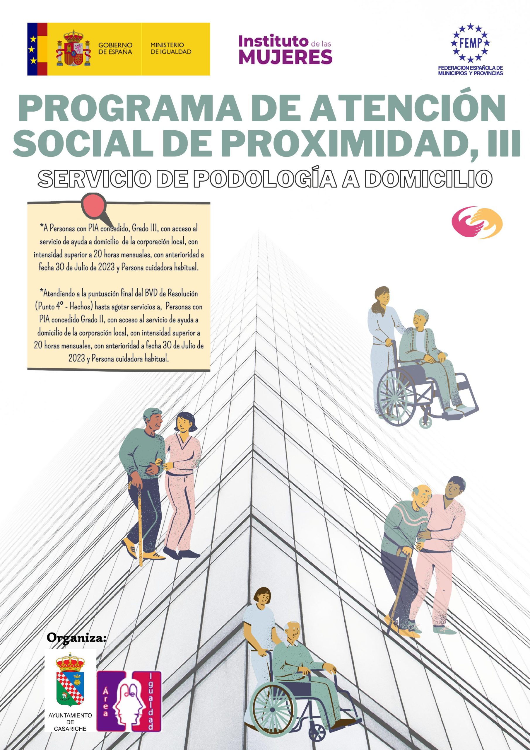El Ayuntamiento de Casariche, desde su Concejalía de Igualdad y en colaboración con la concejalía de Servicios Sociales y el Servicio de Ayuda a Domicilio pone en marcha, hoy 2 de octubre, el Programa de Atención Social de Proximidad III, para personas dependientes con limitación en su autonomía y movilidad reducida, y personas cuidadoras, subvencionado por el Ministerio de Igualdad – Instituto de las Mujeres (IMs), la Federación Española de Municipios y Provincias (FEMP) y el Ayuntamiento de Casariche.