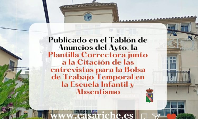 Desde la Delegación de Empleo informamos a todos los vecinos y vecinas de Casariche que ya está disponible, tanto en el Tablón de Anuncios de nuestro Ayuntamiento como en el E-tablón, la plantilla correctora para las pruebas para la Bolsa de Trabajo Temporal en la Escuela Infantil y Absentismo.