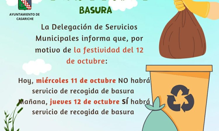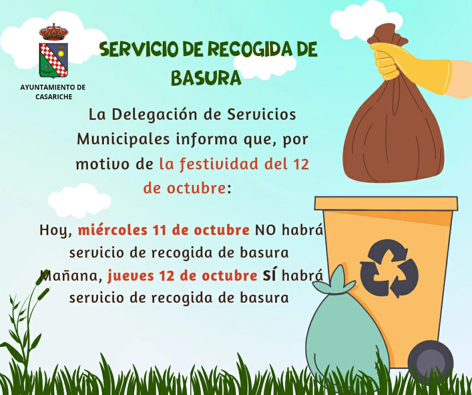 - Noche del miércoles 11 de octubre: No habrá servicio de recogida de basura en su horario habitual.