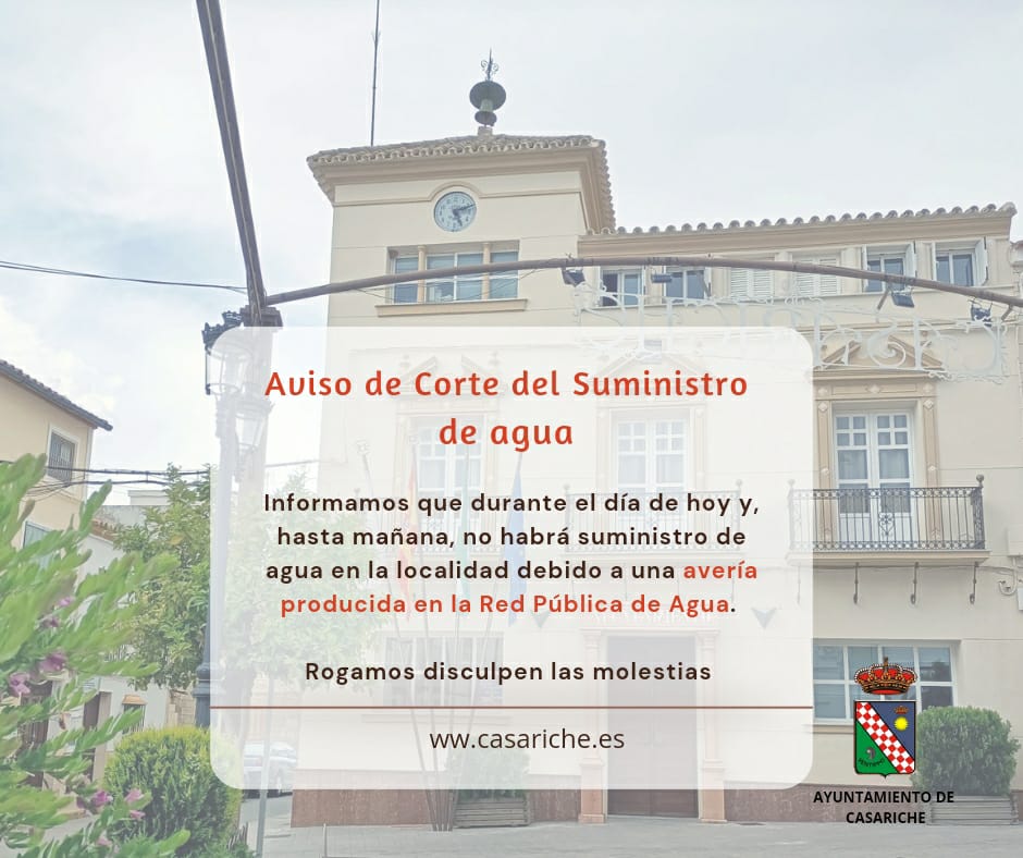 Informamos a los vecinos y vecinas de Casariche que, debido a una avería en la red pública de abastecimiento de agua, durante el día de hoy no habrá suministro de agua en toda la localidad.