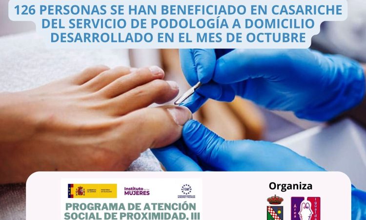 Cabe recordar que el Ayuntamiento de Casariche, desde su Concejalía de Igualdad y en colaboración con la concejalía de Servicios Sociales y el Servicio de Ayuda a Domicilio, ha desarrollado durante el mes de octubre este servicio de podología a domicilio, enmarcado en el Programa de Atención Social de Proximidad III y dirigido a personas dependientes con limitación en su autonomía y movilidad reducida, y personas cuidadoras.