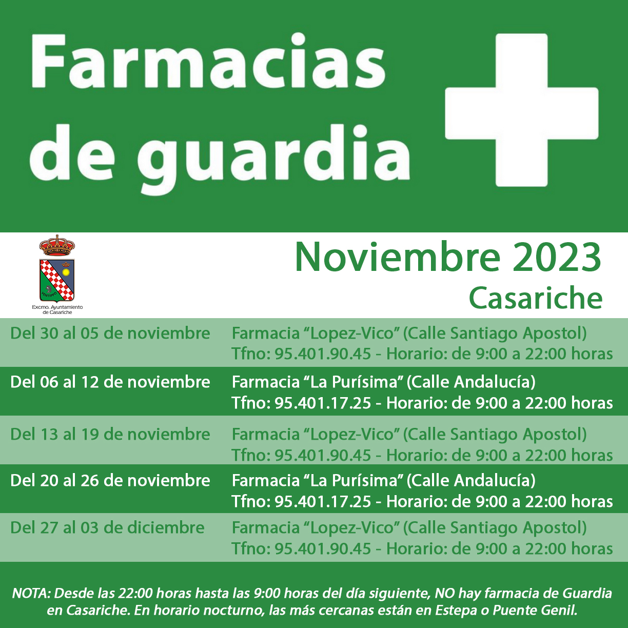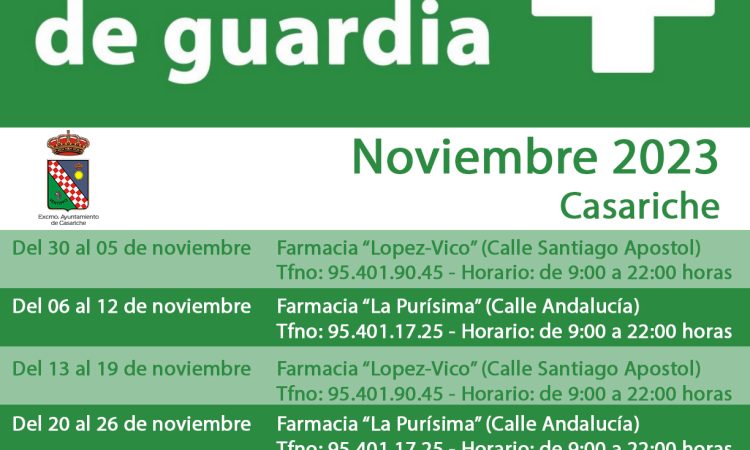 Ya estamos en noviembre y con el fin de que nuestros vecinos y vecinas puedan saber en todo momento qué farmacia estará de guardia en nuestro municipio, el Ayuntamiento pone a su disposición la información relativa a las farmacias de nuestra localidad, incluyendo sus números de teléfono y el horario de apertura que tienen cada uno de los fines de semana del presente mes.