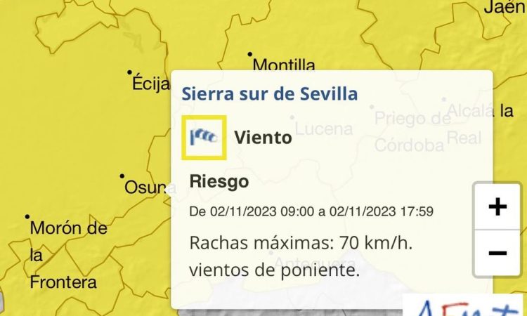 El Ayuntamiento informa que la Agencia Estatal de Meteorología, AEMET, ha activado la alerta amarilla en nuestra comarca por fuertes rachas de vientos que pueden llegar a los 70 km/h, desde las 09:00 h a las 17:59 h aproximadamente, hoy jueves 2 de noviembre.