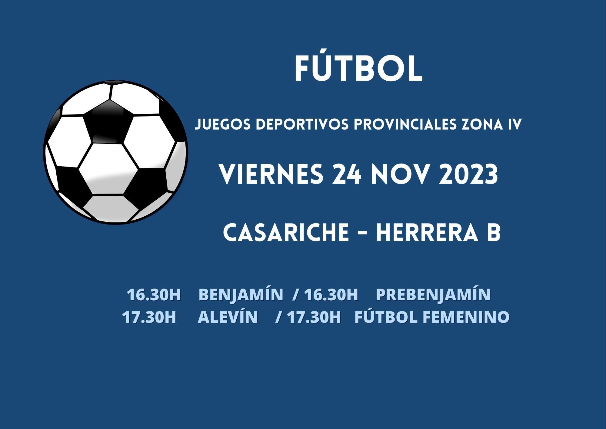 Os facilitamos a continuación las próximas actividades deportivas con participación casaricheña para esta semana: con relación a los Juegos Deportivos Provinciales de la Zona IV, el viernes 24 de noviembre nuestros benjamines, prebenjamines, alevines y fútbol femenino de la Escuela de Fútbol juegan en casa contra el Herrera B y el sábado 25 de noviembre participamos en Pedrera en una Jornada Multideporte.