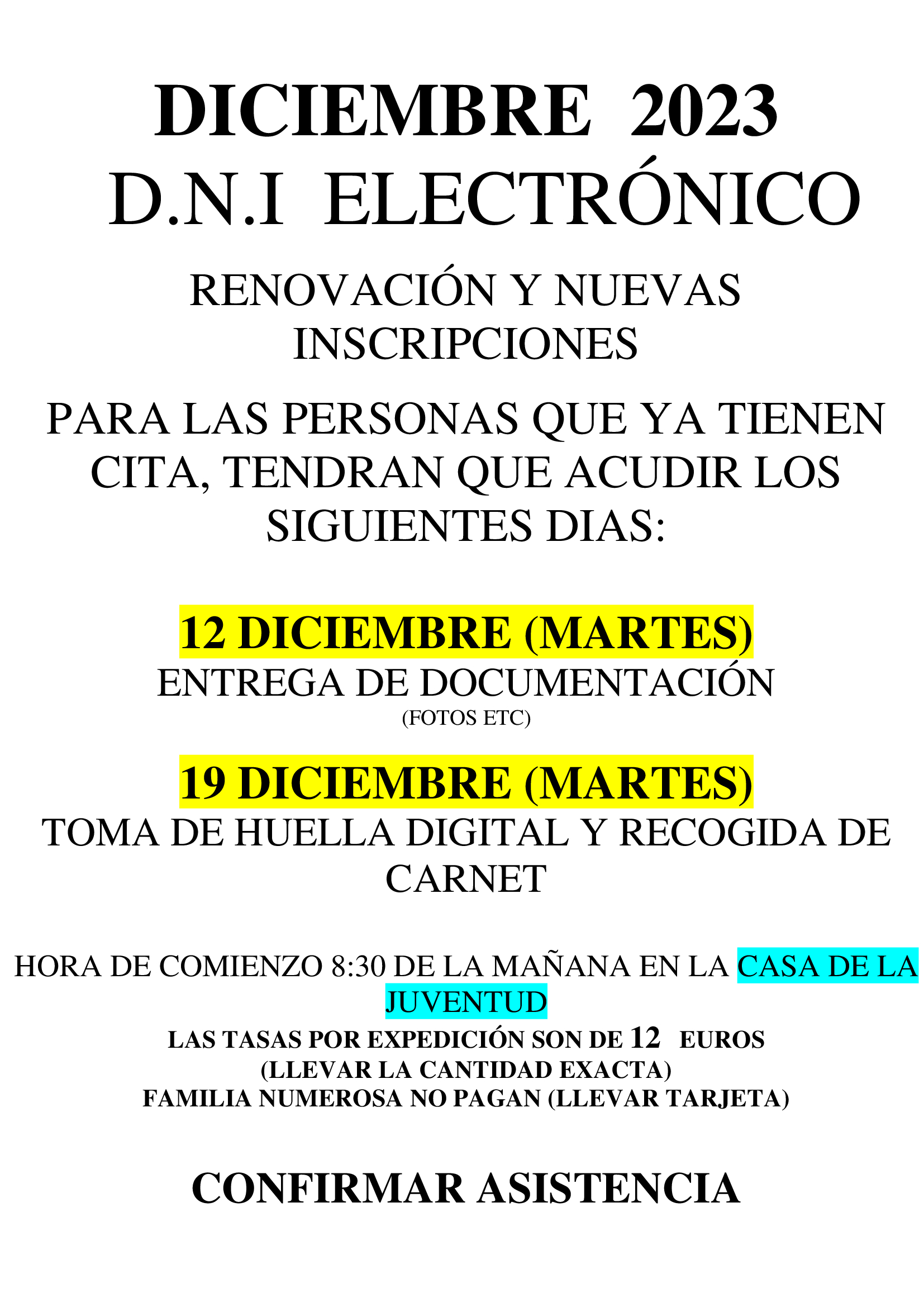 Informamos a todas las personas que ya tienen cita para la renovación y/o nuevas inscripciones del D.N.I. electrónico, que un equipo móvil de la Comisaría de la Policía Nacional se desplazará dos días en el próximo mes de diciembre. Como en ocasiones anteriores, cada vecino/a deberá acudir ambos días, confirmando previamente su asistencia, uno, para entregar la documentación requerida y otro para la toma de huella digital y recogida del carnet.