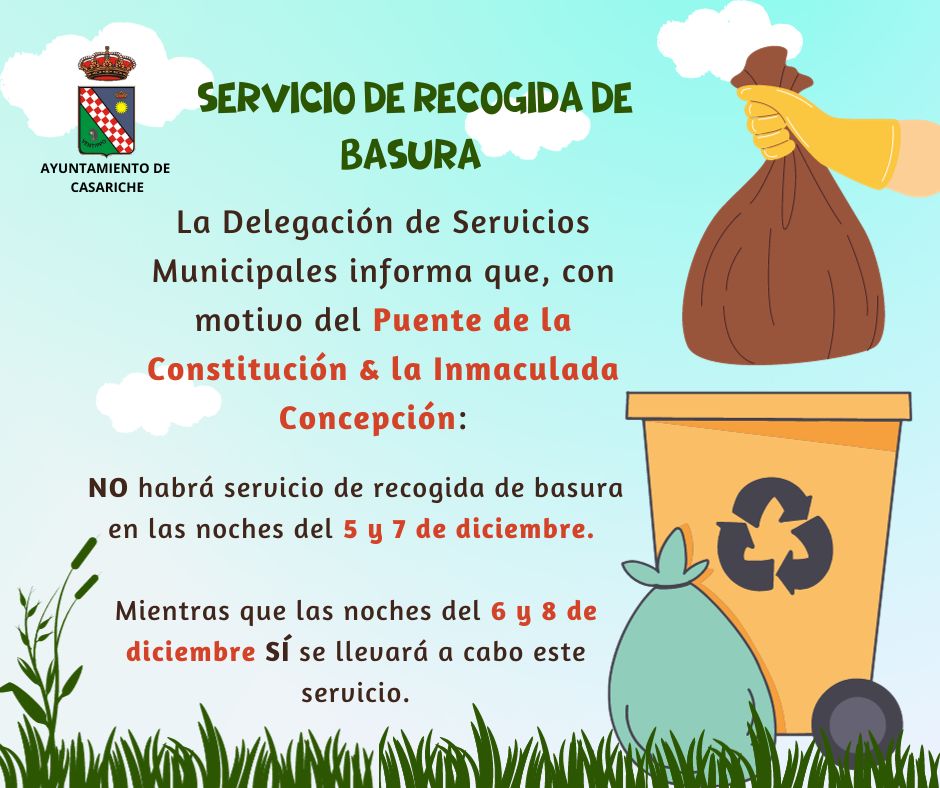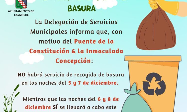 La Delegación de Servicios Municipales del Ayuntamiento informa que, debido a las próximas festividades del Día de la Constitución y de la Inmaculada Concepción en las noches del 5 y 7 de diciembre no habrá servicio de recogida de basura.