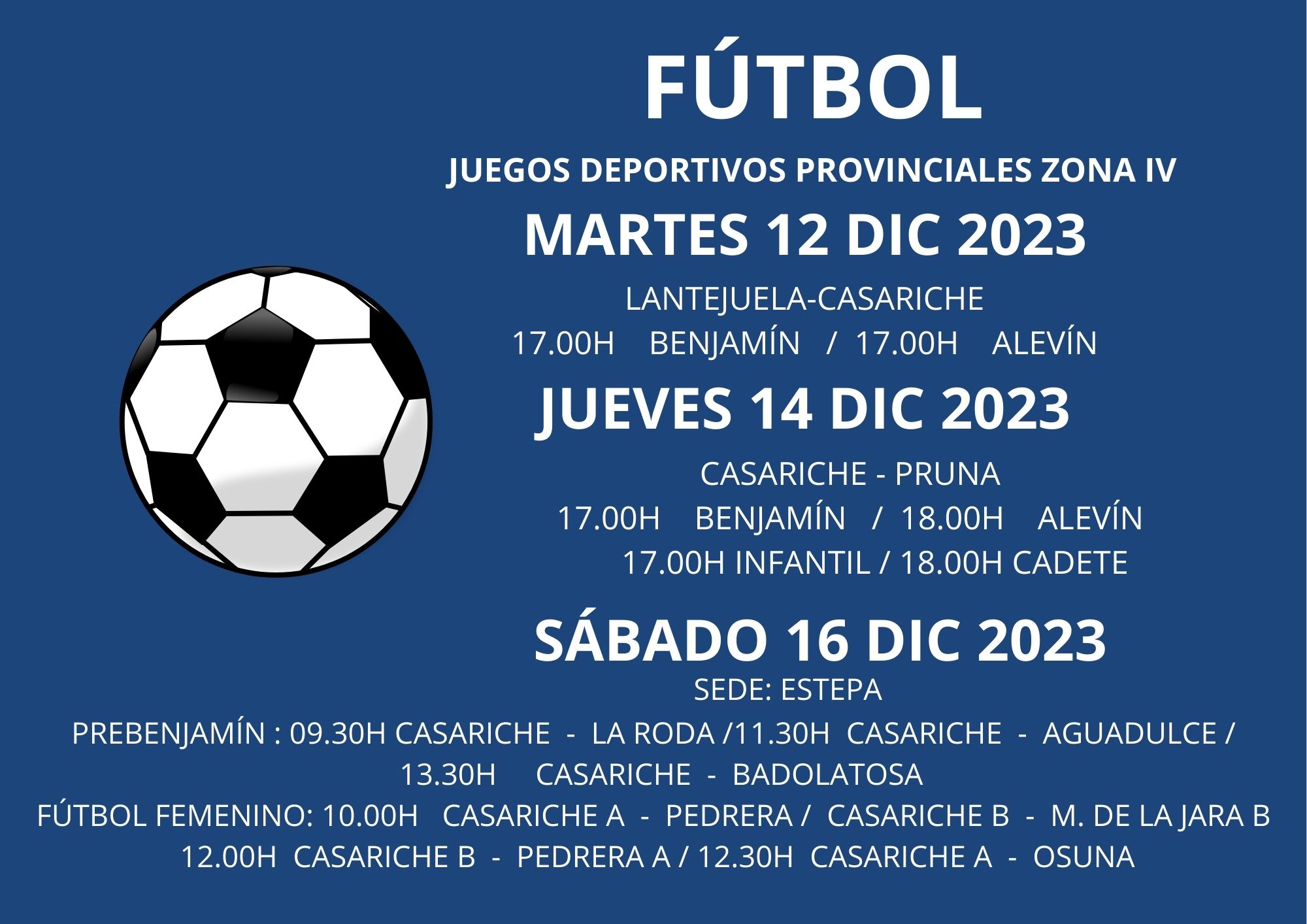 Con relación a los Juegos Deportivos Provinciales de la Zona IV, las actividades deportivas de esta semana arrancaron ayer martes 12 de diciembre con el partido de nuestros benjamines y alevines de la Escuela de Fútbol que jugaron fuera contra La Lantejuela. Continuando con nuestra Escuela de Fútbol, mañana jueves 14 compiten en casa contra Pruna nuestros benjamines alevines, infantiles y cadetes y el sábado 16 disputan su primera jornada de liga en Estepa los prebenjamines y el equipo de fútbol femenino, por un lado, y participamos en Fuentes de Andalucía en una Jornada Multideporte, por otro.