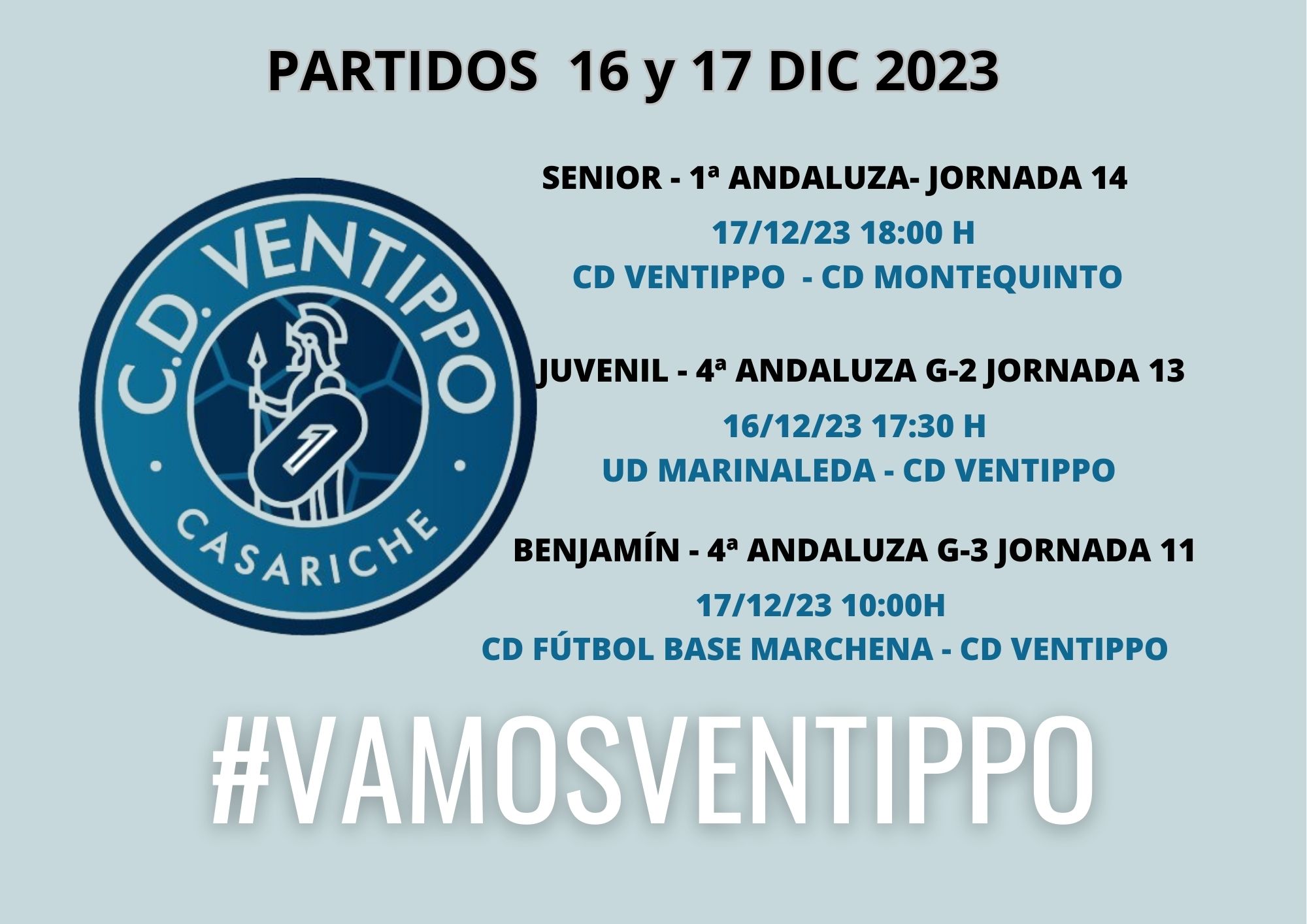 En el caso del CD Ventippo, el sábado 16 de diciembre juegan los juveniles contra el UD Marinaleda en su campo. Por la mañana se desplazan a Marchena los benjamines y por la tarde juegan en el Sergio Carnerero Gil nuestros seniors.