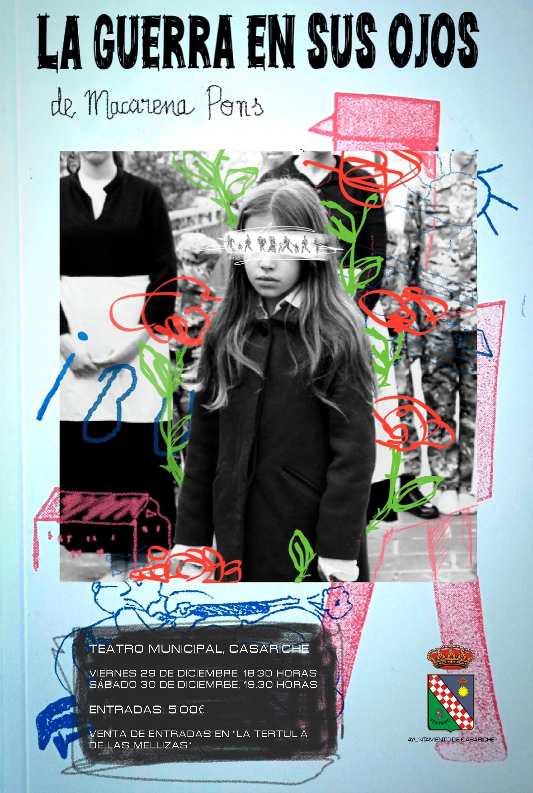 Como actividad final, el alumnado del Taller de Teatro que se ha estado impartiendo en Casariche de octubre a diciembre pondrá en escena ‘La guerra en sus ojos’, bajo la dirección de Macarena Pons, una obra que invita a la reflexión y refleja la experiencia de unas niñas y niños y la enfrenta directamente a través de su mirada. Con una expresión poética que fusiona la fuerza del flamenco y la delicadeza de una niña en busca de su madre, se despliegan en el escenario dos relatos paralelos. Uno se desarrolla en un orfanato, mientras que el otro tiene lugar en el campo de batalla.