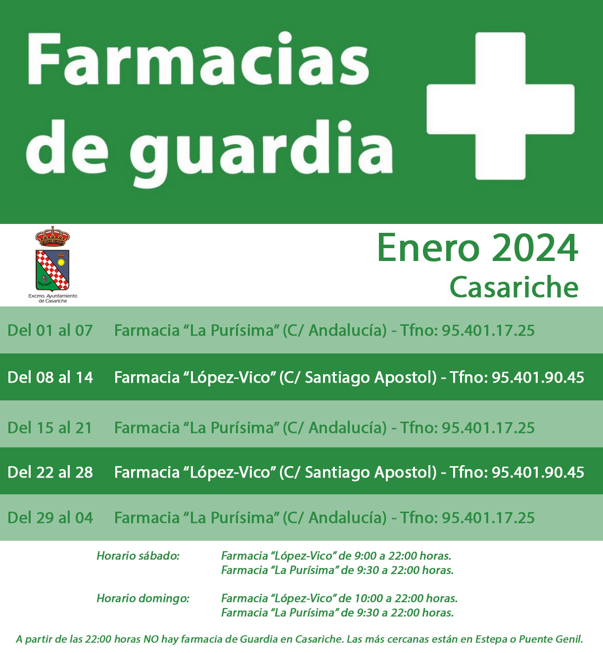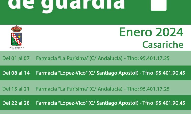 Ha comenzado 2024 y como ya viene siendo habitual, desde el Ayuntamiento ponemos a la disposición de todos nuestros vecinos y vecinas la información relativa a las farmacias de guardia en nuestra localidad durante cada fin de semana.