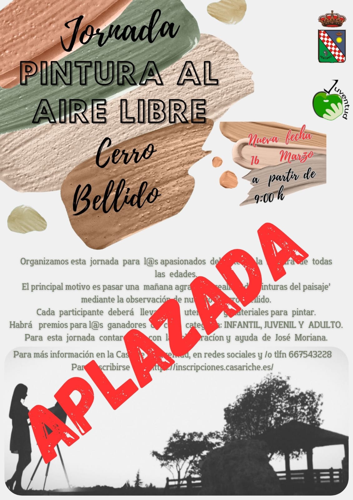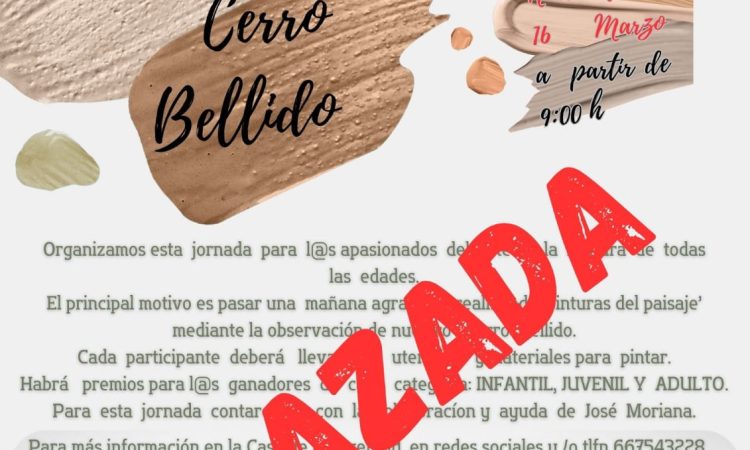 Debido a las condiciones climatológicas, se ha decidido aplazar la Jornada de Pintura al aire libre en el Cerro Bellido, prevista inicialmente para este sábado 13 de enero, hasta el 16 de marzo, una fecha mucho más cercana a la primavera, en la que estamos seguros de que tanto la temperatura como la luz del sol serán mucho más apropiadas para la celebración de la misma.