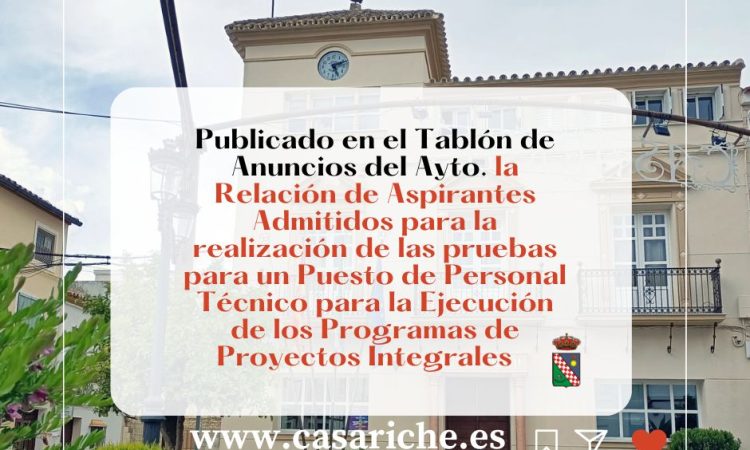 Desde la Delegación de Empleo informamos que ya se encuentra disponible tanto en el Tablón de Anuncios del Ayuntamiento como en el E- Tablón la Relación de Aspirantes Admitidos para la realización de las pruebas para un Puesto de Personal Técnico para la Ejecución de los Programas de Proyectos Integrales
