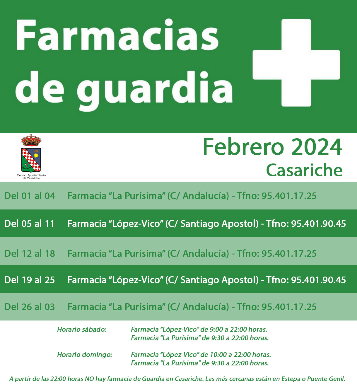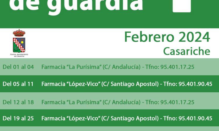 En esta ocasión, la farmacia «La Purísima», en la Calle Andalucía, estará de guardia del 1 al 4 de febrero, en horario de 09:30h de la mañana a 22:00h.