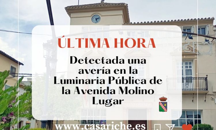 El Ayuntamiento informa que ha sido detectada una avería a raíz de las lluvias que afecta a la Luminaria Pública, concretamente de la Avenida Molino Lugar, por lo que en la tarde – noche de hoy y, hasta que dicha problemática quede solventada, esta zona no tendrá luz en toda la avenida.