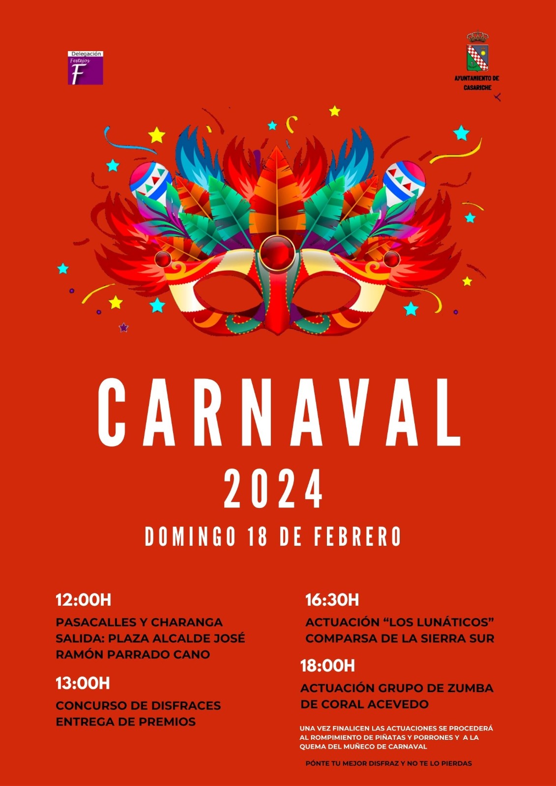 Pero la fiesta no acaba ahí. Y, es que, el domingo continúa nuestro carnaval con el tradicional pasacalles al que animamos a todo el mundo a asistir disfrazado. Este comenzará a partir de las 12:00h desde la Plaza Alcalde José Ramón Parrado Cano y finalizará en La Callegüela donde a la 13:00h aproximadamente se procederá a la entrega de premios del Concurso de Disfraces.