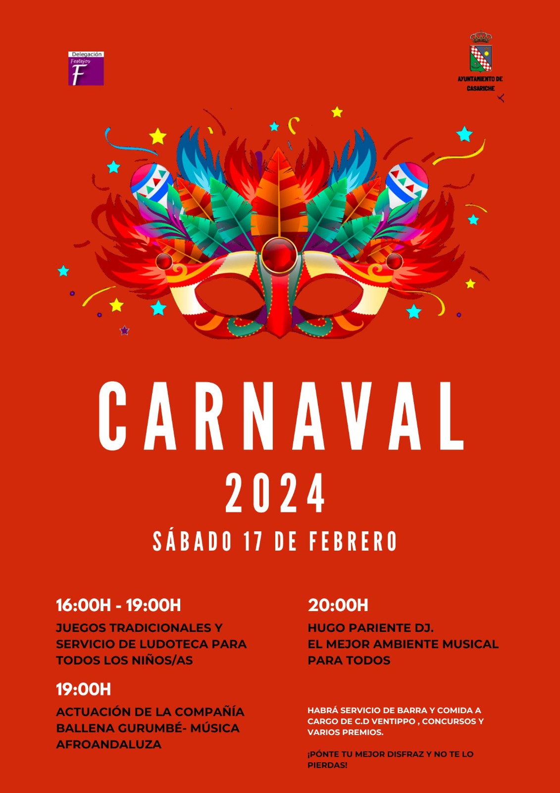Recordamos que, durante los dos días se contará con servicio de barra y comida a cargo del C.D Ventippo. Así que, este fin de semana, ponte tú mejor disfraz y no te pierdas el Carnaval.