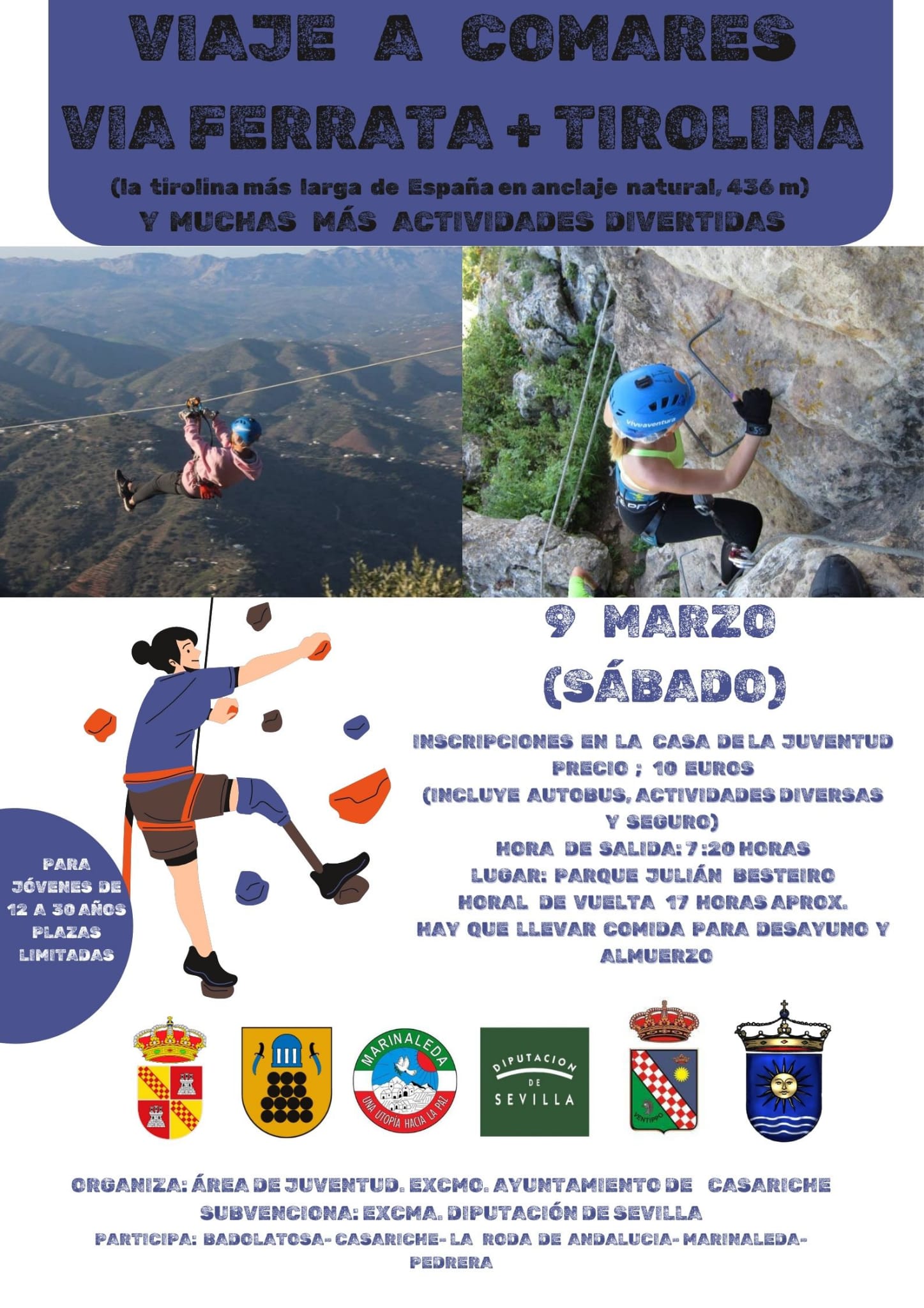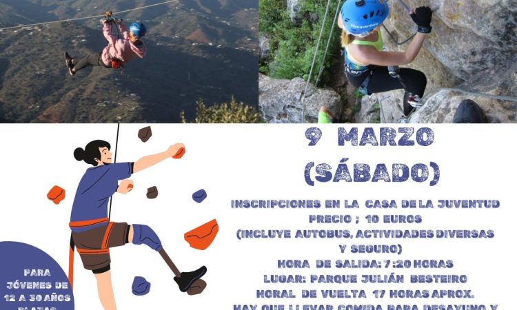 La propuesta que presentamos hoy se llevará a cabo el 9 de marzo en Comares y está dirigida a jóvenes de 12 a 30 años. Se trata de una divertida jornada de turismo de aventura por el municipio de Comares, que incluye escalada por una vía ferrata, rappel, juegos de orientación, cazas fotográfica y tirolina. En concreto, en la tirolina más larga de España en anclaje natural, de 436m.