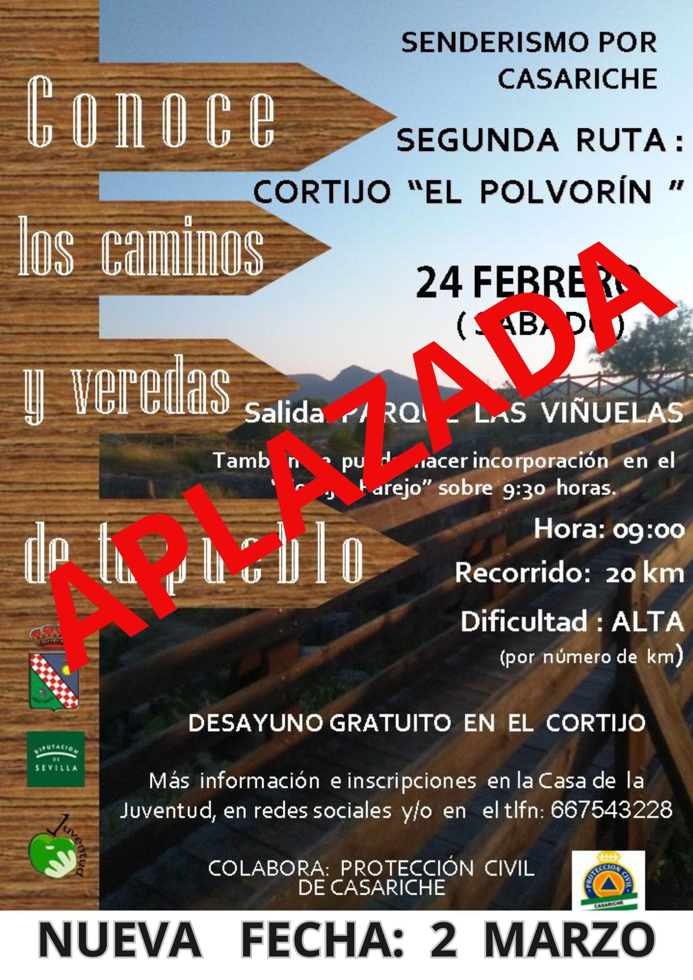 Desde la Delegación de Juventud comunicamos a todas las personas inscritas en la ruta al Cortijo «El Polvorín» fijada para mañana sábado, 24 de febrero que, con motivo de las previsiones de lluvia previstas para las próximas horas, dicha ruta queda aplazada para el próximo fin de semana, concretamente, para el día 2 de marzo.