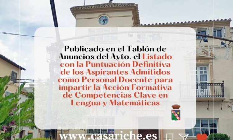 Desde la Delegación de Empleo informamos que ya se pueden consultar en el Tablón de Anuncios del Ayuntamiento y en el E-Tablón las Calificaciones Definitivas de la convocatoria de selección de Personal Docente para impartir la Acción Formativa de Competencias Clave en Lengua y Matemáticas.