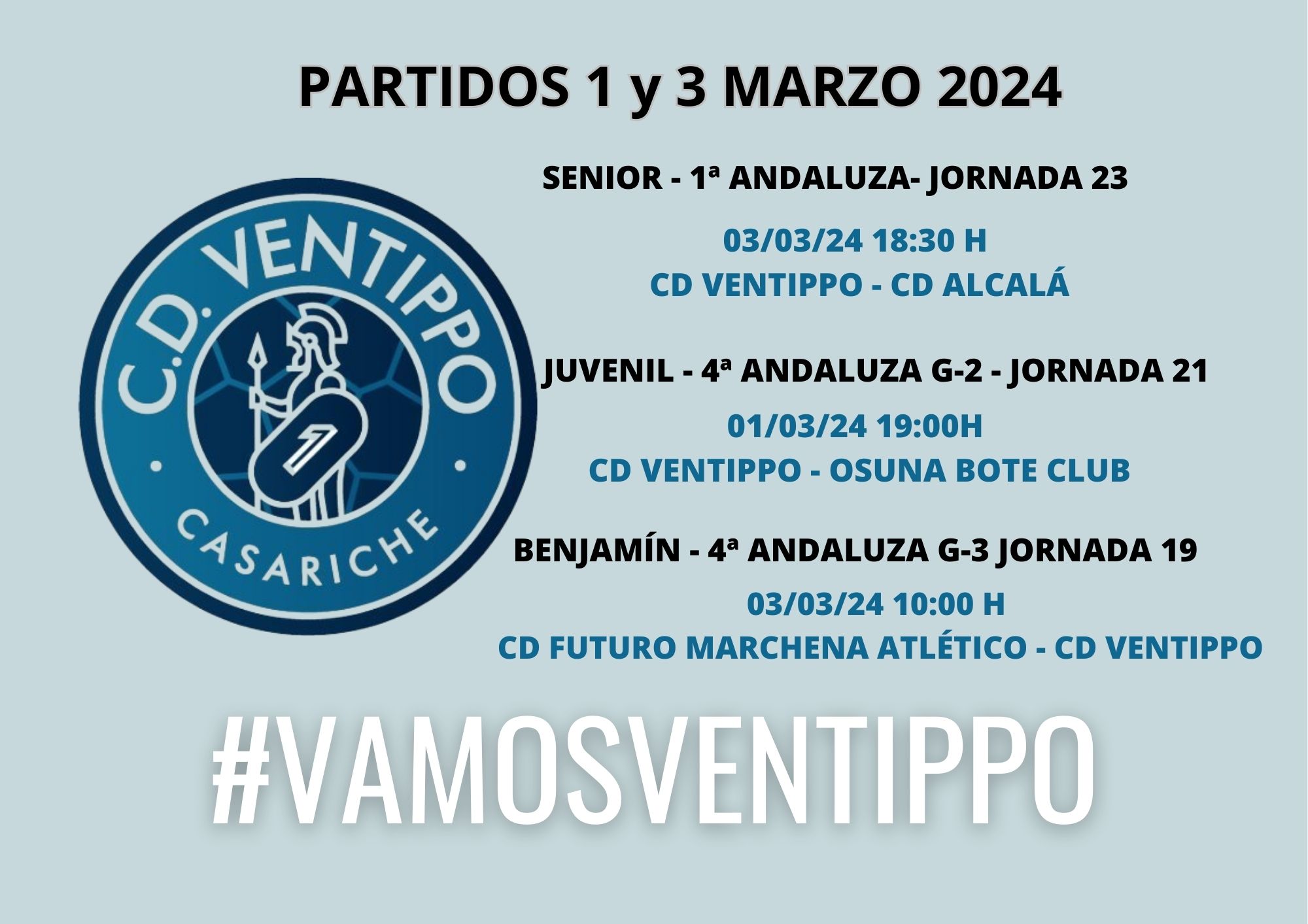 Con respecto al CD Ventippo, mañana viernes día 1 juegan en casa los juveniles, enfrentándose a las 19:00h al Osuna Bote Club, mientras que los benjamines y los seniors juegan el domingo 3 de marzo. Por la mañana a las 10:00h, lo hacen los benjamines que juegan fuera contra el CD Futuro Marchena Altético, y por la tarde es día de partido en el Sergio Carnerero Gil, donde nuestros seniors juegan a las 18:30h contra el CD Alcalá.
