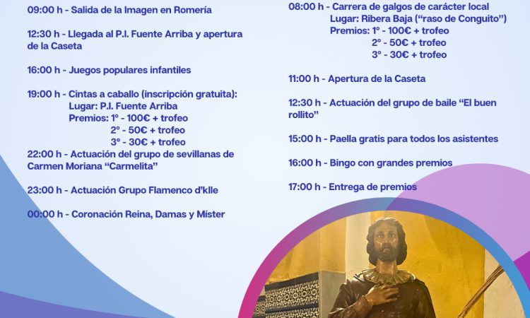08:00h: Carrera de galgos de carácter local en La Ribera Baja (‘raso de Conguito’). Premios: 1º: 100€ + trofeo, 2º: 50€ + trofeo y 3º: 30€ + trofeo.