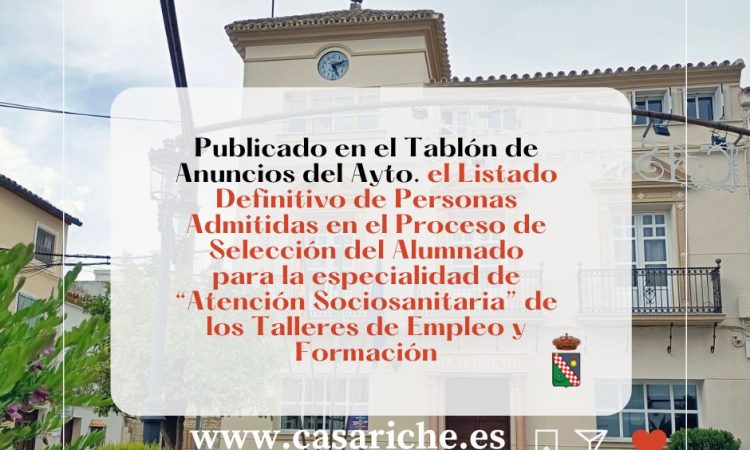 Desde la Delegación de Empleo informamos que ya se puede consultar tanto en el Tablón de Anuncios del Ayuntamiento así como en el E- tablón el Listado Definitivo de Personas Admitidas, en reserva y no admitidas en el procedimiento de selección del alumnado de los programas de Empleo y Formación para la especialidad “Atención sociosanitaria a personas dependientes en Instituciones sociales”